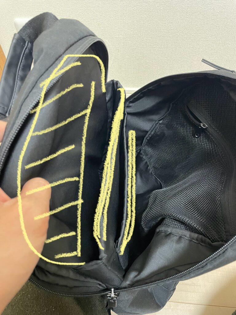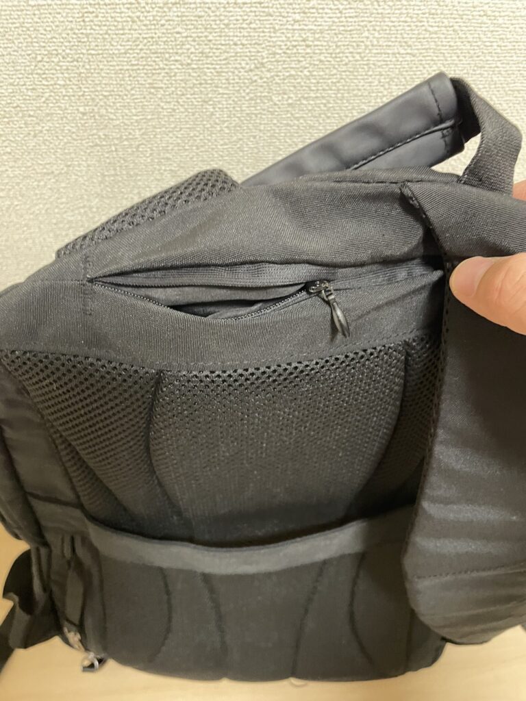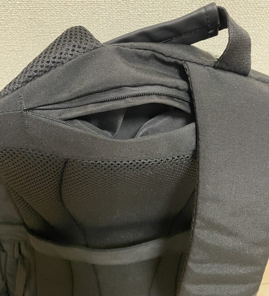 さらにさらに、背中上方部に小さなスペースがあり、ここに定期入れやスマホを入れられてすぐに取り出せます。このスペースがあるのは神ですね。一部のリュックでは見かけますが、なかなかここまで気を利かせるものは少ないですね。
