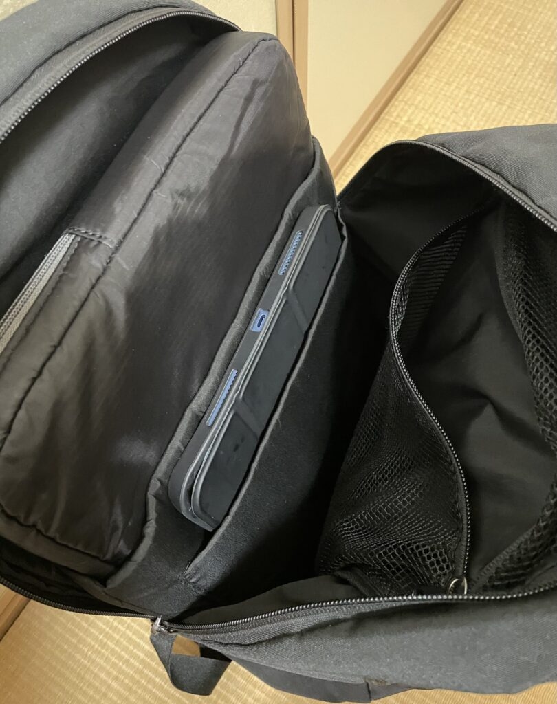 また、下記のように前後に緩衝材が入っているので、多少の衝撃を和らげてくれると思います。ただ、パソコンやタブレット機器を裸で入れるのは怖いので、ちゃんとしたケースに入れてリュックに収納するのが賢明ですね。