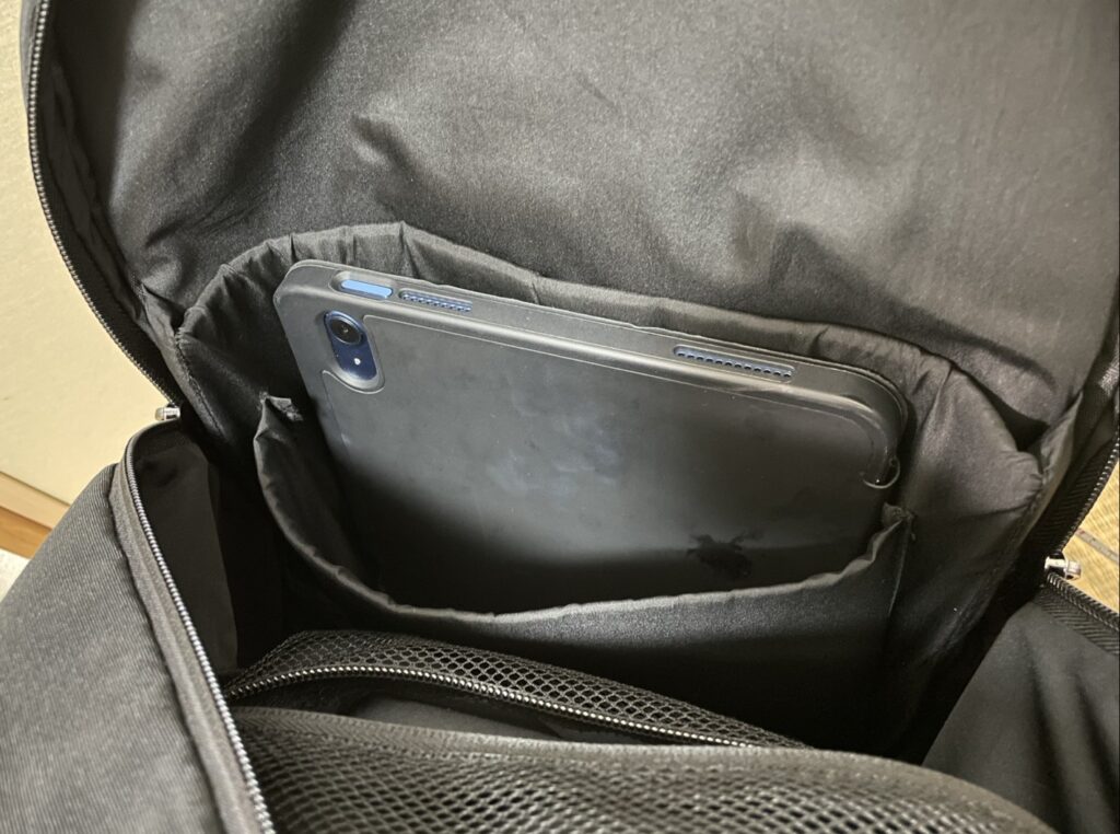 また、もう一つの小型のポケットのスペースには、iPad等のタブレット機器が入ります。